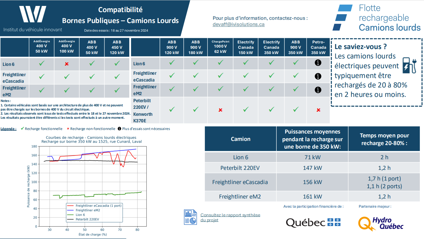 L’Institut du véhicule innovant (IVI) conducted compatibility tests between four electric truck models and several charging station models available in Quebec. IVI also measured the average charging power from 20% to 80% for these trucks.